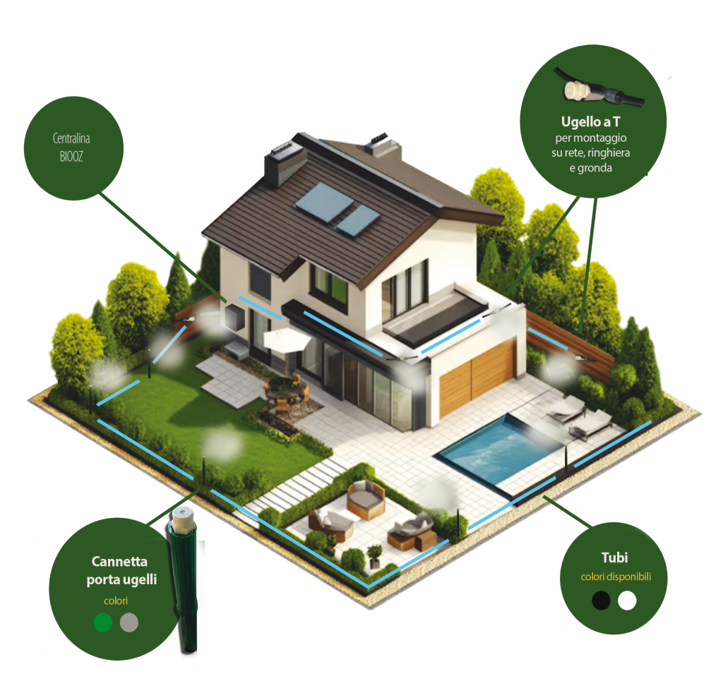 Biooz è il tuo impianto di nebulizzazione antizanzare studiato per offrirti il massimo comfort nei tuoi spazi verdi.