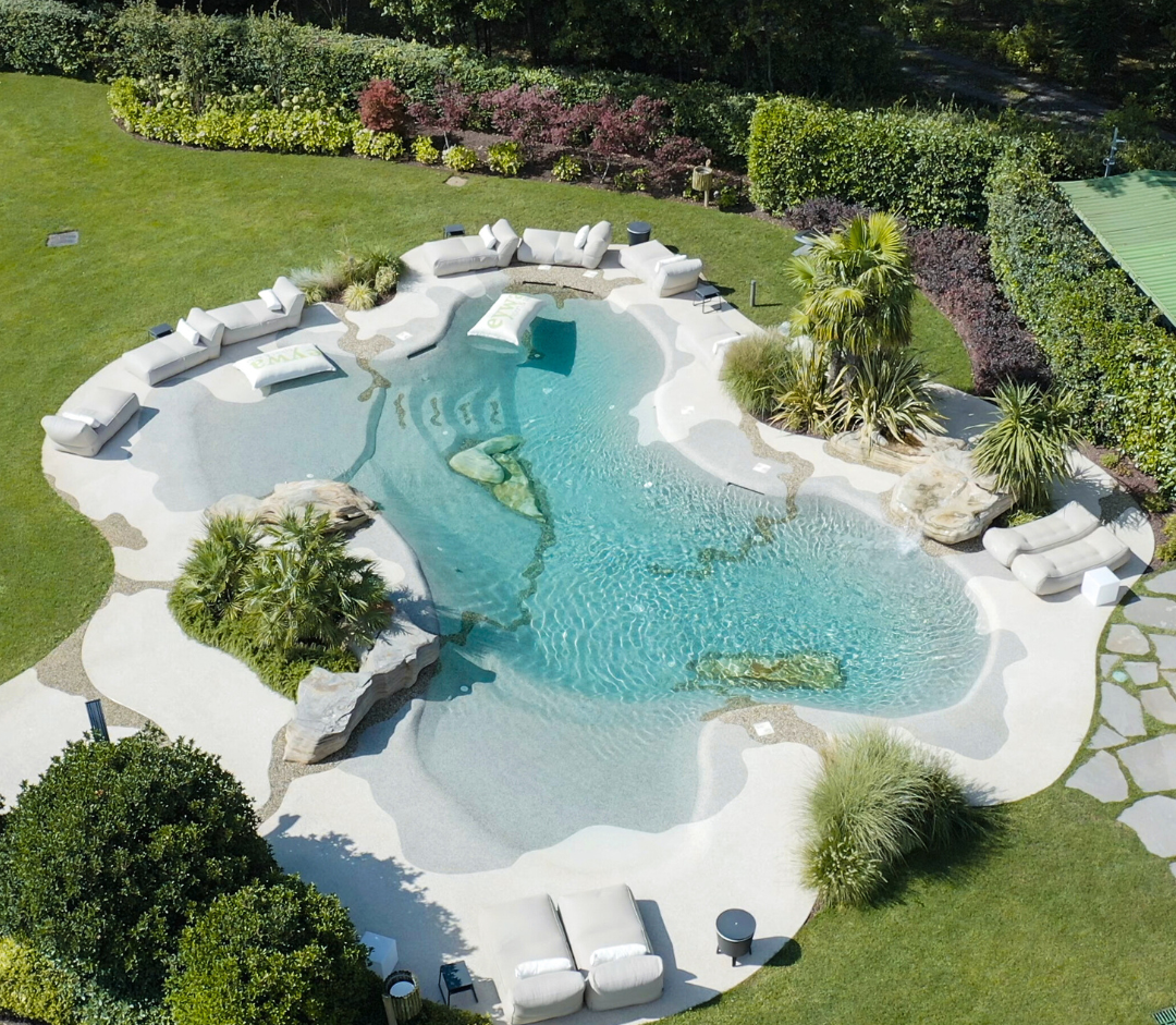 Zone nuoto, spiagge, sedute e camminamenti sommersi, sagomati in pietra naturale, offrono la migliore esperienza di balneazione.